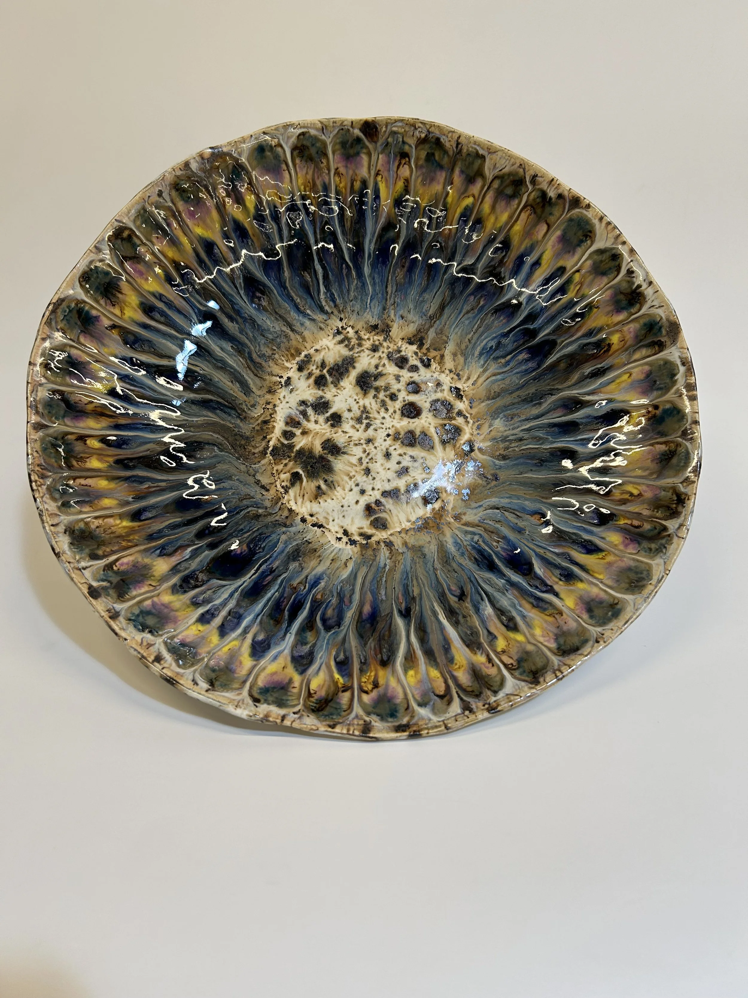 This piece feels like an echo from the natural world—a geological bloom, a watery mandala, or a magnified cross-section of a forest spring. The layered, wavy glaze creates a visual rhythm that pulls the eye inward, like ripples in a pool or rings in a tree. Its organic energy is palpable, yet it holds a sense of stillness at the center, like a quiet breath at the heart of movement.